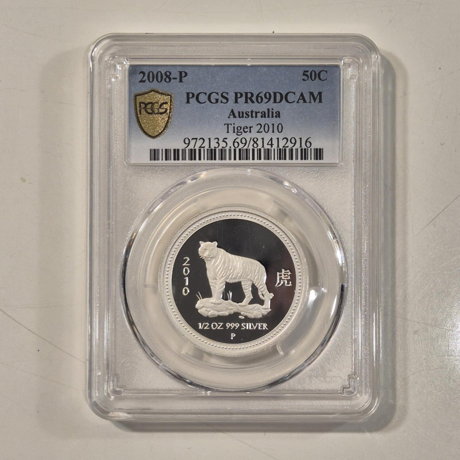 The 2008 Australia Tiger 50c Lunar Series I silver 1/2oz Proof PCGS PR69DCAM Coin is a stunning addition to any coin collection. This Decimal coin, made of 0.999 fine silver, features a beautiful design commemorating the Year of the Tiger. With a Proof strike type, this Australian coin from the 2000s showcases exquisite craftsmanship and detail. Perfect for collectors and investors alike, this coin from Australia's Lunar Series is a must-have for those who appreciate high-quality numismatic pieces.