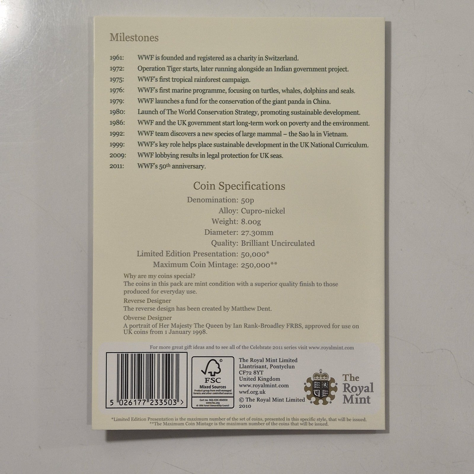 2011 Royal Mint UK GB World Wildlife Fund WWF BU 50p Pence Coin