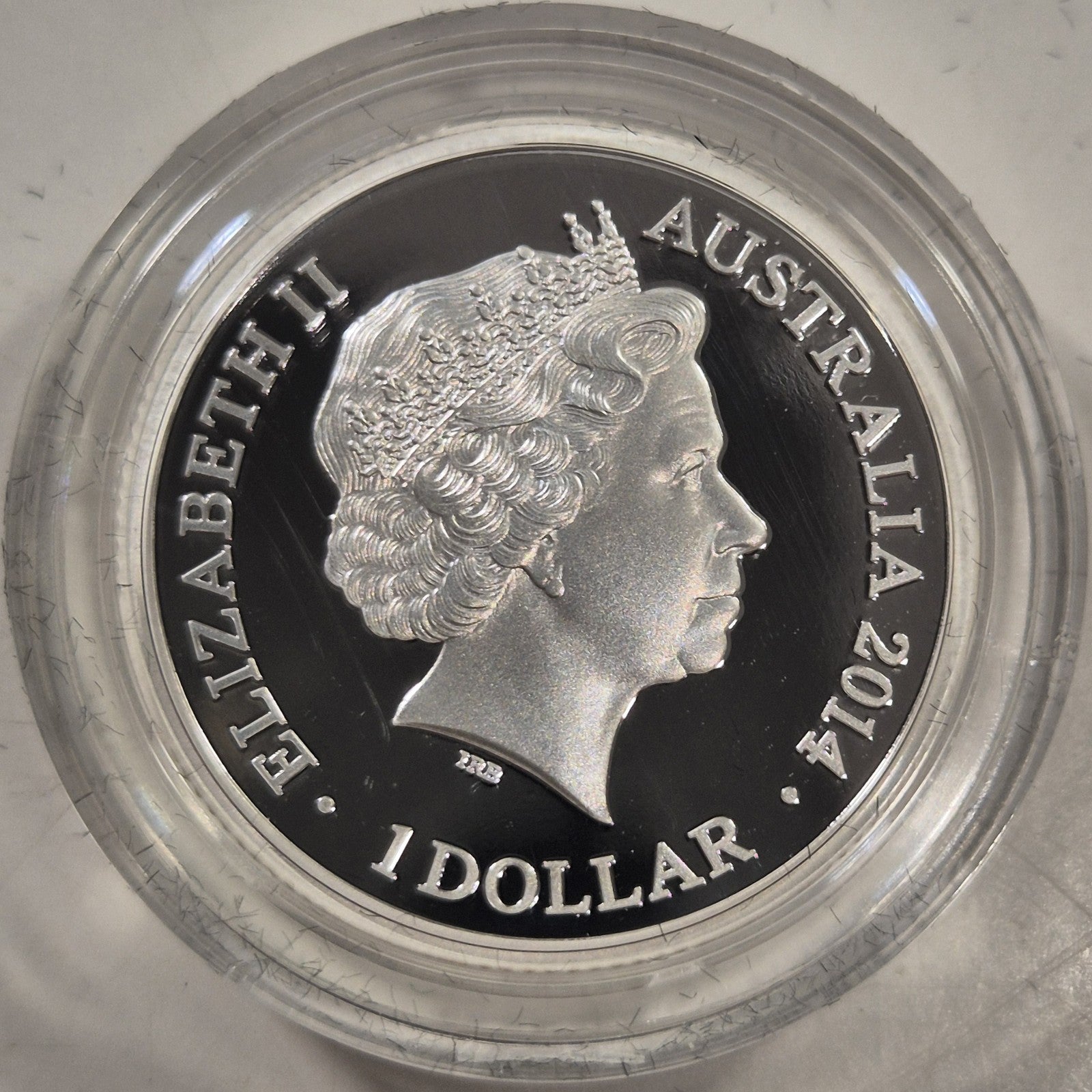 Explore the world of numismatics with the Australia 2014 $1 One Dollar Silver Proof Coin, a testament to the precision and craftsmanship of the Royal Australian Mint. Struck in fine silver with a fineness of 0.999, this decimal coin is a collector’s delight, showcasing the latest effigy of Her Majesty Queen Elizabeth II. The proof quality strike ensures a flawless finish, reflecting the utmost standards of coinage.