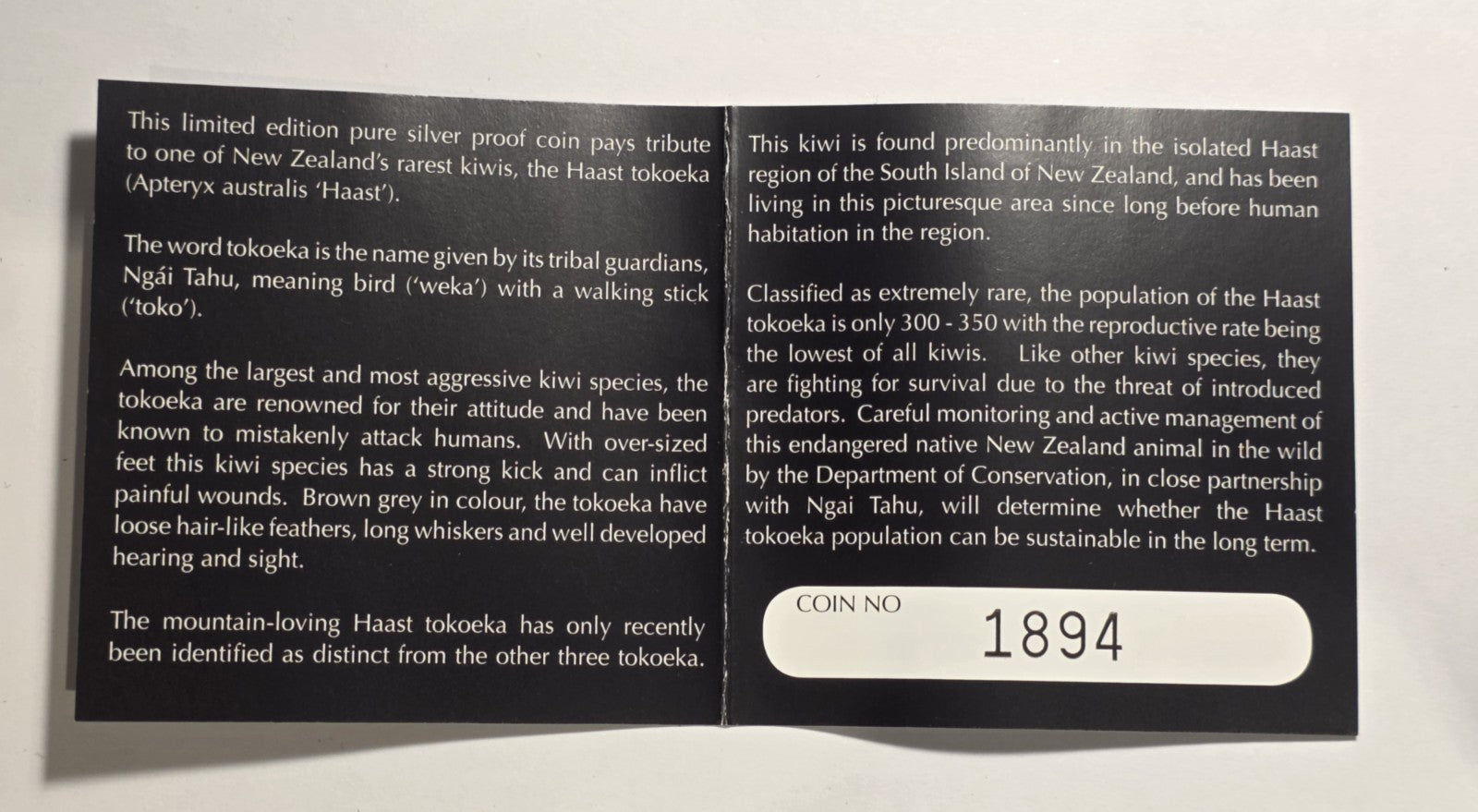 As an uncirculated collectible, it stands as a pristine piece of artistry, unblemished by the passage of time. Composed of silver sourced solely from New Zealand, this coin is a celebration of the country's craftsmanship and a honourable tribute to the Haast Tokoeka Kiwi, making it a distinguished addition to any collection.