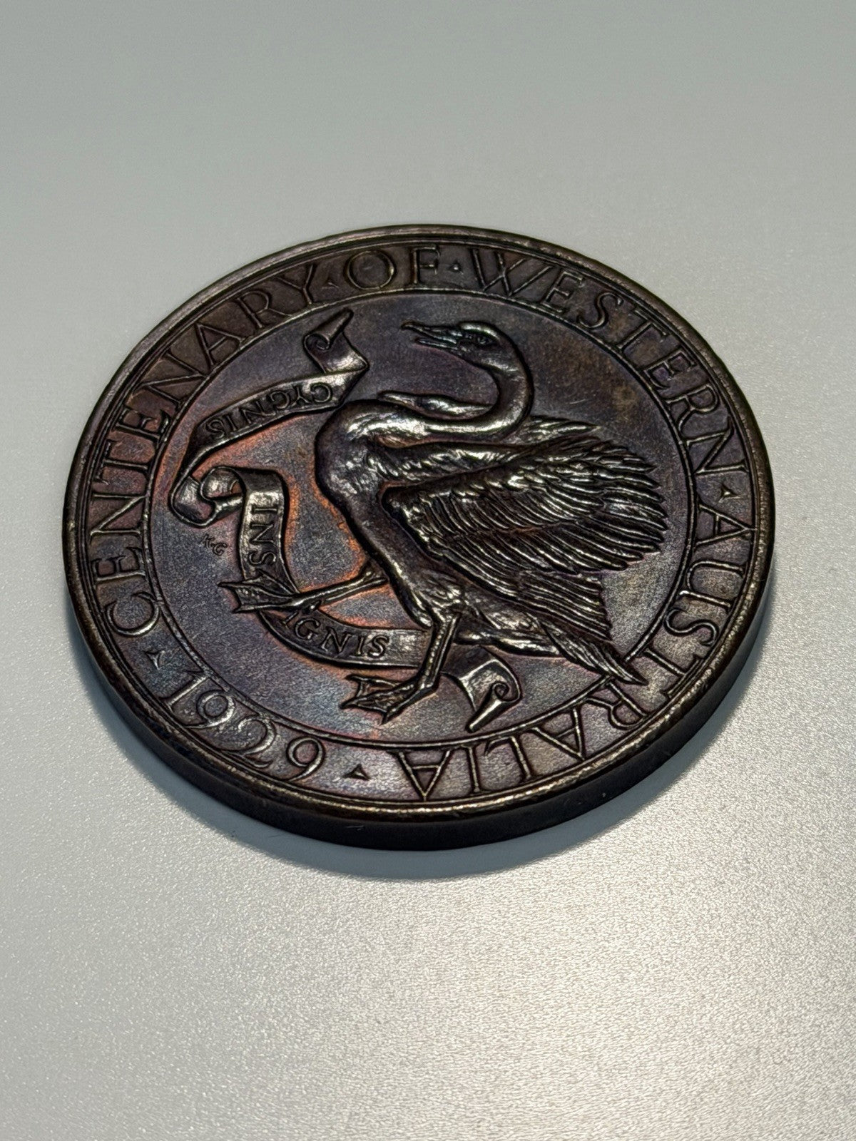 Celebrate a slice of Australian history with the 1929 Western Australia Copper Centenary Medal, featuring King George V on the obverse and a swan on the reverse. This medal is a tangible piece of the 1920s era, minted to commemorate an important anniversary, and is a must-have for collectors of Australian exonumia.